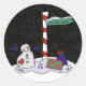 O boneco de neve está vestido com luvas e botões azuis. O boneco de neve está ao lado de um polo branco e vermelho com uma placa verde que diz "Polo Norte". Os presentes estão ao lado do polo. A neve branca está deitada no chão. Os autocolantes estão disponíveis com um fundo branco ou preto.