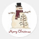 Estes bonitos adesivos de envelopes de férias são feitos em um estilo primitivo de arte gráfica do país. Um boneco de neve festivo no chapéu e cachecol está parado ao lado de um pinheiro pequeno. Feliz Natal em texto vermelho, sob o boneco de neve. Personalize o texto para dizer o que quiser.