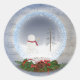 Homem de neve de Natal num globo de neve com pinheiro e bagas.