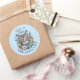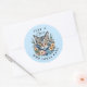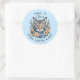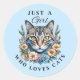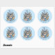 Gato de brindle de cinza de aquarela, cômoda, rodeado de flores rosa e azuis.