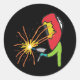 Trabalhos de metais que utilizam uma ferramenta de soldadura - o soldador veste máscara de proteção e luvas e cria um chá de faíscas com este processo perigoso e excitante. Para escultura criativa ou simplesmente trabalho industrial duro - uma imagem para os soldadores entre nós.