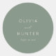 This wedding sticker features a minimalist design with a solid, muted sage green background. The layout is clean and balanced, showcasing two names in modern sans-serif typography with an elegant cursive "and" connecting them. Below the names, there's space for a date, adding a personal touch to this sophisticated design. The overall mood is calm and refined, making it perfect for couples seeking a timeless and understated look for their special day.