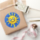 Rosto Sorridente Sol Sunny, este design de crianças bonitinho apresenta um lindo Rosto Sorridente Sol em um fundo azul céu.