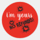 Divirta-se um pouco com este Dia de os namorados com o adesivo "Eu sou seu SEM RESTITUIÇÕES!". Este adesivo tem um fundo vermelho e um texto branco que diz "Sou seu". Num texto negro e brincalhão, as palavras, SEM RESTITUIÇÕES! Este design também tem três corações pretos com pintura esplotada.