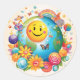 Um adesivo circular colorido com um planeta feliz projetado por eventos planetários felizes