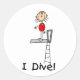 Uma figura de palito em um bifurcão vermelho prestes a pegar um texto em estilo de mergulho e criança que diz "I Dive" está em destaque nessas camisetas bonitinhas bonitinhas, canecas, sacos de tote, adesivos, ímanes e muito mais.