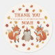 Add a touch of woodland magic to your celebration with this adorable autumn woodland thank-you sticker featuring the text “Thank you for coming to my birthday party – Noah”! With two playful foxes and a sweet owl surrounded by softly falling fall leaves, this whimsical boho watercolor design is perfect for a boy or girl birthday with a fall or harvest theme. The orange text, font, and beige background color can all be customized to match your style. Part of a matching woodland birthday collection with invitations, favor bags, thank-you cards, party supplies, gifts, and decor. Ideal for autumn, rustic, boho, or nature-inspired birthday celebrations!