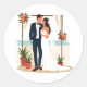 Inclui 20 pequenos adesivos numa única folha. Ilustração deliciosa de noiva e noiva compartilhando um beijo sob um arco floral na praia, perfeito para personalizar presentes.