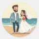 Inclui 20 pequenos adesivos numa única folha. Um belo adesivo de desenho animado com noiva sorridente e noivo numa praia, perfeito para comemorações de casamento.