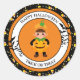 Este adesivo redondo de pequeno tamanho é mostrado num impressão de criança de abóbora de Halloween. Personalize este item ou comprar como está. Imagem do stock all-free-download.com