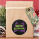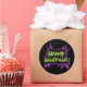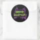 Um adesivo de forma redonda mostrado a preto com um impressão Feliz de Halloween. Personalize este item ou comprar como está.