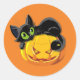 Um adesivo em forma redonda, mostrado em laranja com um gato preto no Halloween numa abóbora. Personalize este item ou comprar como está.