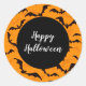 Um adesivo redondo pequeno é mostrado num impressão de morcegos assustadores do Halloween. Personalize este item ou comprar como está.