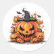 O adesivo redondo é mostrado com um impressão de arte festivo de abóboras de Halloween. Personalize este item ou comprar como está.