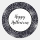 Um adesivo redondo pequeno é mostrado num impressão de teias de aranha do Halloween. Personalize este item ou comprar como está.