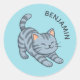 Adesivo Redondo Stretching Grey Tabby Cat Blue Custom Name