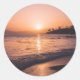 Foto impressionante de um pôr do sol sobre uma praia deserta com montanhas e palmeiras à distância.