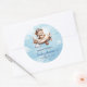 Celebrate your little aviator’s upcoming arrival with this adorable boy baby shower sticker featuring a cute teddy bear pilot flying a vintage airplane. Designed in a charming blue and brown color palette, this aviation-themed sticker adds the perfect touch of sweetness and adventure to any baby shower décor. Use it for favor bags, envelopes, gift packaging, party décor, thank-you tags, or diaper raffle prizes to instantly elevate your event’s theme.