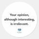 Uma frase favorita do Pragmatic Institute, este adesivo vai ajudá-lo a mostrar o seu valor para a voz do mercado sobre as opiniões internas. Sua opinião, embora interessante, é irrelevante.