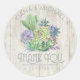 Fontes únicas, suculentos de aquarelas coloridas e fundos de pranchas de madeira rústicas são os destaques desses produtos de casamento mistos e compatíveis. Este belo adesivo tem um texto "Obrigado" opcional junto com uma modelo para editar as iniciais da noiva e do noivo, uma mensagem pessoal e a data do casamento. Procure ID515 para ver todos os produtos correspondentes neste conjunto.