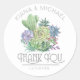 Fontes únicas, suculentos coloridos de aquarelas e fundos brilhantes em um primavera verde macio são os destaques desses produtos de casamento misturados e combinados. Este belo adesivo tem um texto "Obrigado" opcional junto com uma modelo para editar as iniciais da noiva e do noivo, uma mensagem pessoal e a data do casamento. Procure ID515 para ver todos os produtos correspondentes neste conjunto.