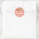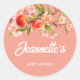 Round sticker. The design features lush watercolor peaches and pink blossoms set against a warm coral background.