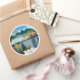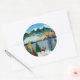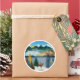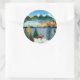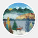 Uma bela paisagem com cores e texturas únicas mostrando uma paisagem de montanha e lago e uma floresta multicolorida com um sol ascensão e um alce em tons de azul, verde, ouro e magenta.