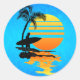 Surfando arte de surfista em pé na praia e um nascer do sol sobre a água.
