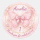 Celebrate your little girl’s Sweet One birthday with this elegant pink butterfly thank you sticker featuring a delicate satin bow, gold circle frame, and soft pearl accents. Perfect for 1st birthday party favors, treat bags, dessert table decorations, and gift wrapping. A charming coquette-inspired design that adds a luxury touch to your butterfly birthday theme.