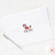 Um gato de mesa vestindo um chapéu de Natal vermelho e um suéter com uma árvore de Natal na cauda, flocos de neve sobre um fundo branco.