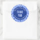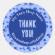 Um pequeno obrigado redondo que você cola para os proprietários de pequenas empresas. Inclua o nome e o URL do compro ou a mídia social/e-mail em texto curvo. O adesivo está em tons de azul com "obrigado" no centro. O design de fronteira é um tema de tricô de gatos puxando bolas de fio, tricotando agulhas e pequenos projetos sendo tricotados. Os adesivos vêm em dois tamanhos. O design funcionará melhor em adesivos redondos ou quadrados.