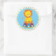 Este adesivo com tema circo apresenta um fundo azul rodeado por um padrão repetitivo de estrelas vermelhas, azuis, amarelas e verdes. Um lindo leão de desenho animado se senta sobre um pedastal no meio do adesivo. Esta design faz parte da minha coleção "Circus Themed Festa de aniversário". Clip-art por Prettygrafik design etsy.com/shop/Prettygrafikdesign