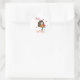 Alô adesivo clássico de outono redondo Tema de outono. O Sticker apresenta uma rapariga com balde de maçãs e algumas folhas.