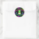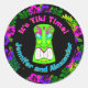 Um adesivo redondo giro para um chá tiki tropical colorido, um impressão hibisco hawaiano sobre fundo preto com flores brilhantes, cor-de-rosa e azuis e verde-luxuoso é impresso com seus nomes, uma máscara tiki verde brilhante e a expressão "É o tempo de Tiki!"