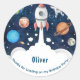 Kids Space Theam graças ao Classic Round Sticker Esta festa de aniversário favorece o adesivo com ilustração aquática do espaço com planetas, foguetes, estrelas e astronauta no espaço com texto azul de fundo diz "Obrigado por pousar na minha festa de aniversário!. "Todos os textos são totalmente personalizados com a ferramenta de edição.