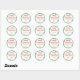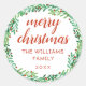Um adesivo de Natal redondo com "natal alegre" escrito em um roteiro de caligrafia vermelha junto com seu nome e o ano dentro uma coroa de folhas desenhada manualmente em diferentes tons de verde com muitas pequenas bagas vermelhas.