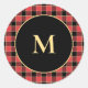 Este adesivo é embelezado com uma versão modificada de um padrão clássico de verificação de búfalos em vermelho e preto com um sotaque de linha amarela. Este design foi criado com uma imagem SVG na qual todos os elementos, assim como a forma em círculo e o texto em monograma, apresentam cores que podem ser personalizadas pelo comprador.