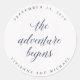 Este adesivo chic, da moda de casamento diz que "a aventura começa" em bue watercolor parece tipografia em um papel branco, aquarela, com espaço para sua data de casamento e nomes. Este adesivo coordena-se perfeitamente com a nossa coleção de "casamento do mapa do mundo azul".