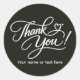 A romantic, personalized “Thank You!” sticker featuring elegant flowing calligraphy with delicate swashes and a subtle heart accent. Customized with names and date, this timeless black-on-white design is perfect for weddings, engagements, and special celebrations. A graceful finishing touch for your unforgettable day.