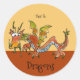 Uma ilustração de um dragão branco em um adesivo redondo está em castanhos, dourados, laranja, com um azul pálido embaixo. Você pode editar texto para criar seu próprio presente personalizado. Precisa de ajuda, envie um email para lilly@lillyarts.com