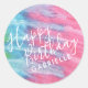 Adesivo personalizado de corante de gravata com texto e nome Feliz de aniversário, em cores modernas, rosadas e aquais, azul-lacrimogêneo, com uma textura de tecido divertida que se parece com uma t-shirt autêntica e tinturada.