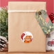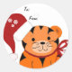 Um fofo tigre de desenho animado decolou num chapéu vermelho de santa com flocos de neve brancos. Um arco vermelho no pescoço.
