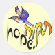 Uma pomba com padrão de terra voa com a palavra "Tikvah" em letras amarelas/laranja hebraicas e "Esperança" em letras negras.