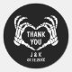 Obrigado de casamento preto que você cola da coleção "Até a morte nos separe". Ele apresenta mãos esqueléticas assustadoras formando um coração na frente. Fornecimentos de festas com data editável e as iniciais ou nomes da noiva e do noivo. Visite nossa coleção para ver mais itens coordenadores que correspondam a este design para seu evento especial.