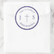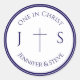 Design features the initials of bride and groom displayed in a navy-blue print. The image of a cross is featured between initials. The customizable phrase, "One in Christ" is displayed above as an arch. Names of bride and groom are featured at bottom. Design is framed by an elegant navy and white border. Designed to coordinate with the Timeless Catholic Monogrammed Wedding Suite.