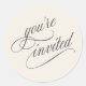 Adicione um toque especial aos seus convites ou correspondência com este adesivo "você está convidado" com uma bela face do tipo caligrafia. Mostrado aqui com um fundo bege neutro, você pode alterar a cor de fundo para corresponder ao seu tema de evento escolhendo "personalizar" e selecionando uma cor de fundo diferente.