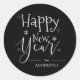 Tipografia Preta e Branca Elegante Nome Feliz Ano Novo Clássico Adesivo Redondo . Celebre o ano novo com estilo usando este Adesivo Redondo Clássico de Tipografia Preta e Branca Elegante com o Nome Feliz Ano Novo. Com uma tipografia minimalista em um fundo preto elegante, este adesivo personalizado adiciona um toque refinado aos seus brindes de festa, cartões ou embalagens de presentes. Perfeito para celebrações modernas, eventos corporativos ou correspondência de feriados elegantes.