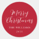 Este adesivo personalizado de Natal moderno e minimalista, com nome da família e ano, apresenta uma elegante tipografia moderna em caligrafia branca com fundo vermelho.