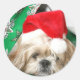 Creme e branco Shih Tzu, vestido de todas as festividades de Natal, se refuga de todas as atividades sob papel de embrulho de Natal enquanto ainda veste seu adesivo de Natal para o Papai Noel