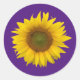 Tendy round sticker com uma imagem brilhante de girassol amarela colocada sobre um fundo roxo. Excelente para adicionar o toque final às suas cartas ou presentes.